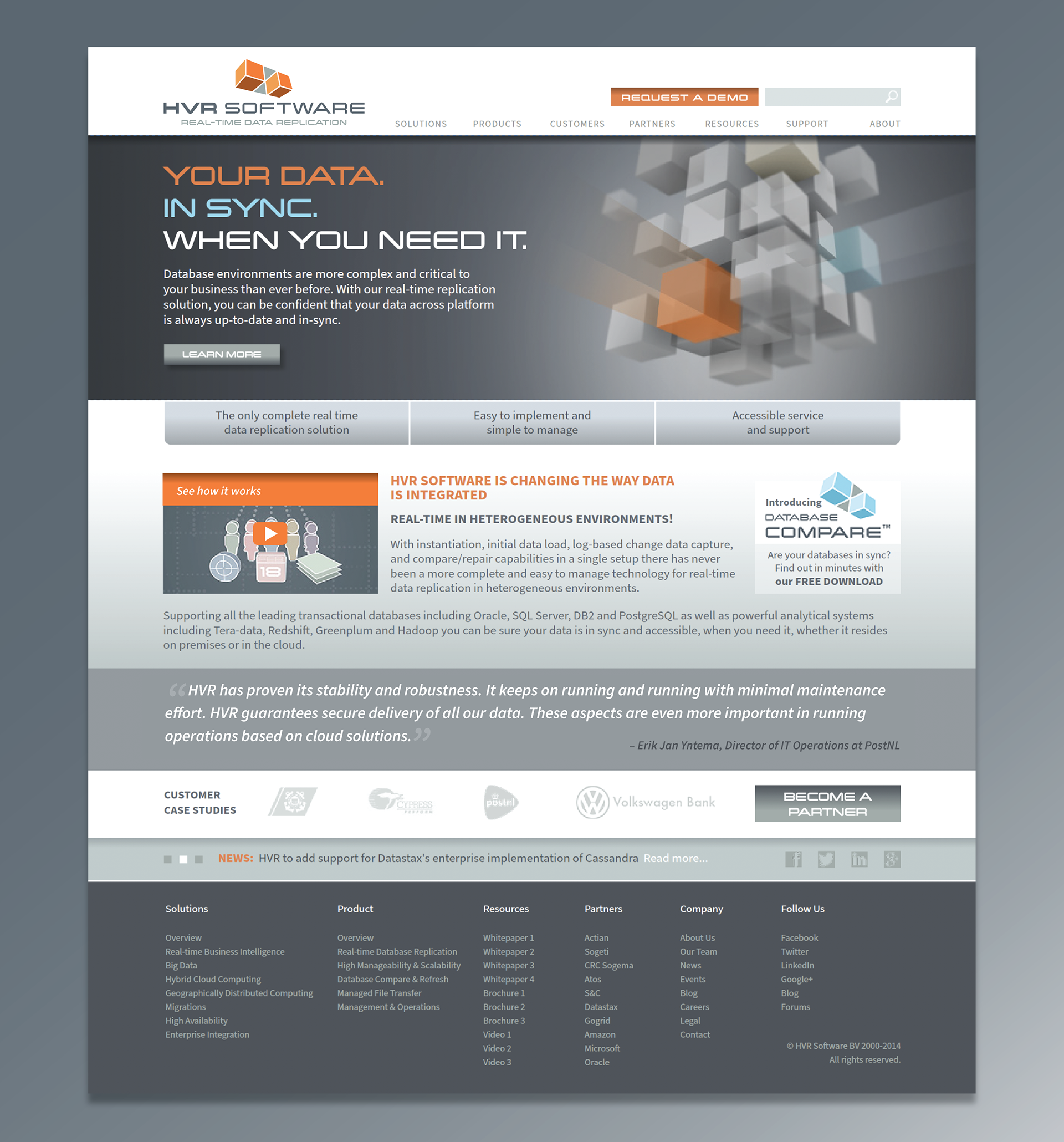 I was hired by HVR Software from the Netherlands to create it's corporate identity, branded collateral, website, and digital and printed marketing content. As an industry leader in big data management, they wanted a strong mark that communicated technology, performance and real-time data replication capability.